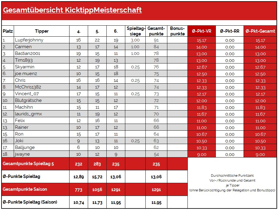Größter Vorsprung an Punkten (Tabellenführer) | 7 Punkte (6. Spieltag) | Lupferjohnny |
