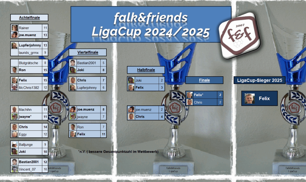 LigaCup 2024/2025 LigaCup-Sieger 2024/2025: Felix Liga-Cup-Turnierplan (K.O.-Runde) Statistik Spieltagsübersichten Spieltagsübersicht 1. Runde Spieltagsübersicht 2. Runde Spieltagsübersicht Achtelfinale Spieltagsübersicht Viertelfinale Spieltagsübersicht Halbfinale Spieltagsübersicht Finale